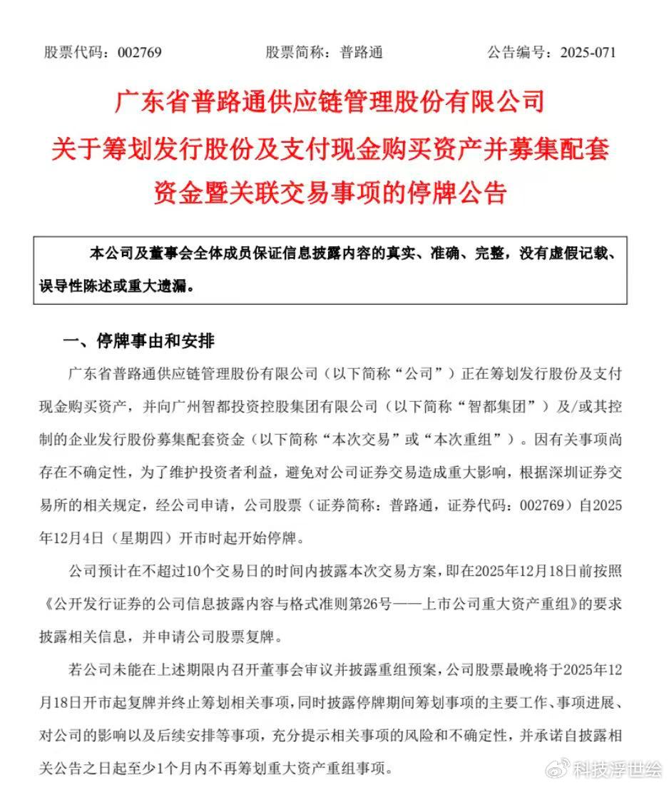 2025年12月3日晚间,深交所上市公司普路通(002769.SZ)发布公告,正在筹划发行股份及支付现金购买乐其集团(Leqee Group Limited)的控制权。