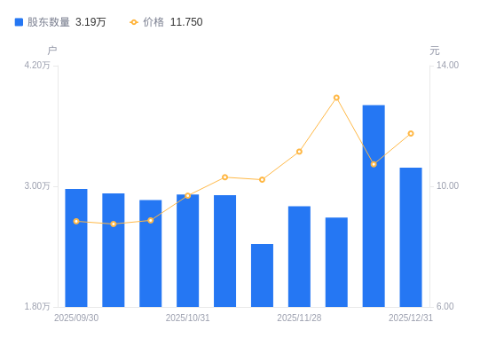 近一年(2024年12月31日至2025年12月31日),普路通A股股东户数从2.91万户,增加至3.19万户,增幅9.60%,区间股价上涨65.03%。