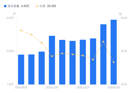 近一年(2025年2月10日至2026年1月30日),康弘药业A股股东户数从3.25万户,增加至3.45万户,增幅6.17%,区间股价上涨53.75%。