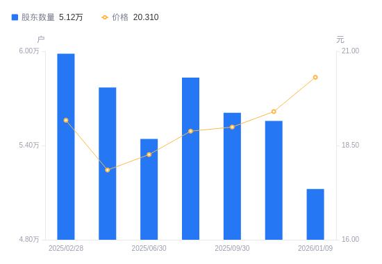 1月19日消息,数据显示,截至2026年1月9日,久远银海A股股东总户数为5.12万户,较上期(2025年11月28日)减少4325户,降幅7.78%。公司最新A股总股本为4.08亿股,其中流通A股4.05亿股,户均持有流通A股数量为7894.91股,较上期增加614.55股,增幅8.44%;户均持流通A股市值16.03万元,较上期增加1.91万元,增幅13.53%。