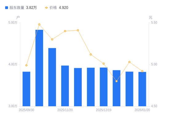 1月21日消息,数据显示,截至2026年1月20日,罗欣药业A股股东总户数为3.82万户,较上期(2026年1月9日)减少70户,降幅0.18%。公司最新A股总股本为10.88亿股,其中流通A股10.86亿股,户均持有流通A股数量为2.84万股,较上期增加51.96股,增幅0.18%;户均持流通A股市值13.98万元,较上期减少2864.61元,降幅2.01%。