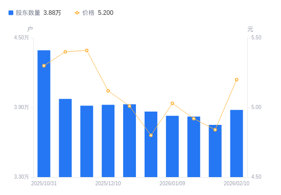 2月11日消息,数据显示,截至2026年2月10日,罗欣药业A股股东总户数为3.88万户,较上期(2026年1月30日)增加1293户,增幅3.45%。公司最新A股总股本为10.88亿股,其中流通A股10.86亿股,户均持有流通A股数量为2.8万股,较上期减少965.4股,降幅3.33%;户均持流通A股市值14.56万元,较上期增加5405.99元,增幅3.86%。