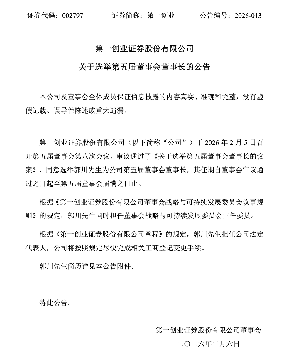 2025年7月,原董事长吴礼顺以“工作调整”为由辞去董事长等职务后,第一创业的董事长一直处于空缺状态,由副董事长青美平措代行;2026年1月,郭川当选为第五届董事会非独立董事,当时就有消息传出郭川将担任董事长。