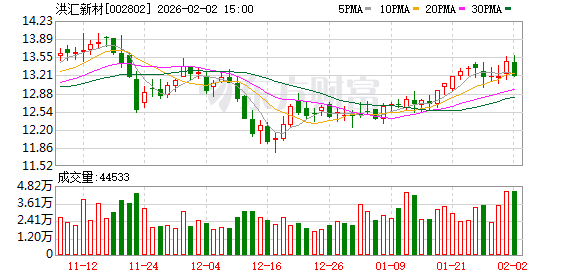 证券日报网讯 2月2日,洪汇新材发布公告称,截至2026年1月31日,公司通过回购股份专用证券账户以集中竞价方式回购公司股份1,056,100股,占公司目前总股本的0.58%,最高成交价为13.01元/股,最低成交价为12.34元/股,支付的总金额为13,497,198元(不含交易费用)。