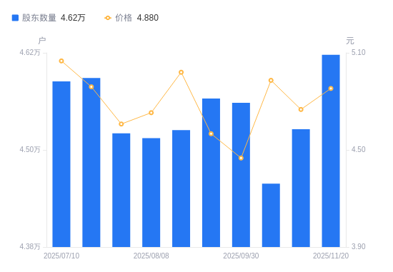 近一年(2024年11月20日至2025年11月20日),江阴银行A股股东户数从4.91万户,减低至4.62万户,降幅5.96%,区间股价上涨19.61%。