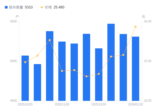 1月21日消息,数据显示,截至2026年1月20日,*ST和科A股股东总户数为5310户,较上期(2026年1月9日)减少33户,降幅0.62%。公司最新A股总股本为1亿股,其中流通A股1亿股,户均持有流通A股数量为1.88万股,较上期增加116.31股,增幅0.62%;户均持流通A股市值47.98万元,较上期增加5.63万元,增幅13.29%。