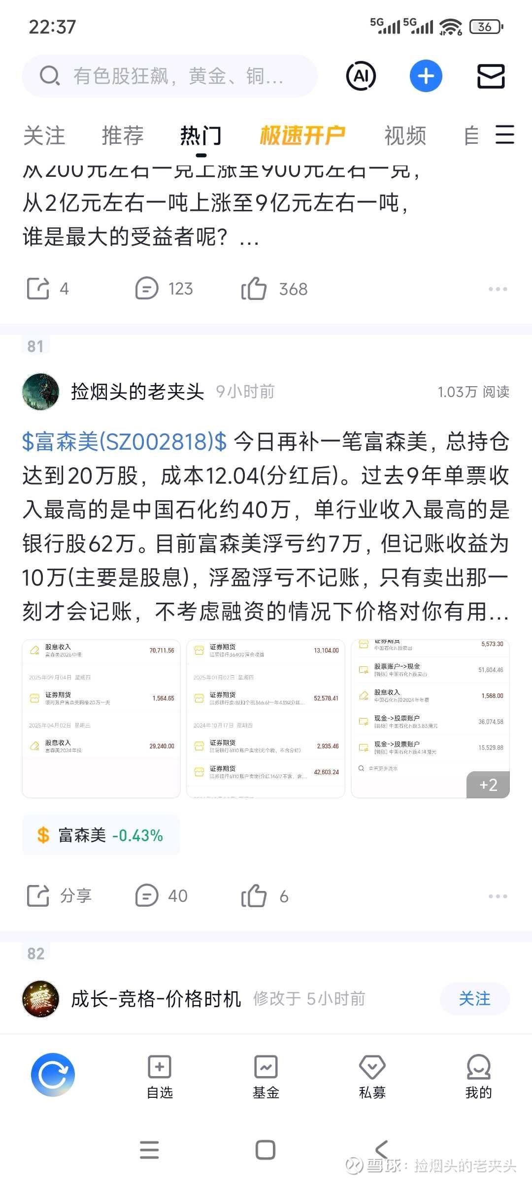 今日再补一笔富森美,总持仓达到20万股,成本12.04(分红后)。过去9年单票收入最高的是中国石化约40万,单行业收入最高的是银行股62万。目前富森美浮亏约7万,但记账收益为10万(主要是股息),浮盈浮亏不记账,只有卖出那一刻才会记账,不考虑融资的情况下价格对你有用的时间点只...