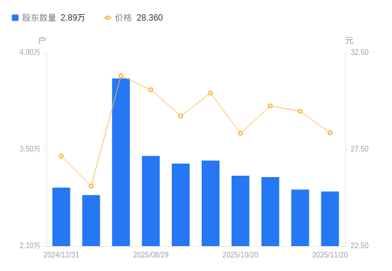 11月26日消息,数据显示,截至2025年11月20日,东方中科A股股东总户数为2.89万户,较上期(2025年11月10日)减少276户,降幅0.95%。公司最新A股总股本为3亿股,其中流通A股2.35亿股,户均持有流通A股数量为8134.51股,较上期增加76.95股,增幅0.96%;户均持流通A股市值23.07万元,较上期减少6761.48元,降幅2.85%。