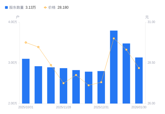 2月5日消息,数据显示,截至2026年1月30日,东方中科A股股东总户数为3.13万户,较上期(2026年1月20日)减少3434户,降幅9.88%。公司最新A股总股本为3亿股,其中流通A股2.35亿股,户均持有流通A股数量为7505.01股,较上期增加741.5股,增幅10.96%;户均持流通A股市值21.15万元,较上期增加1.33万元,增幅6.69%。