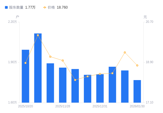 2月2日消息,数据显示,截至2026年1月30日,易明医药A股股东总户数为1.77万户,较上期(2026年1月20日)减少717户,降幅3.90%。公司最新A股总股本为1.91亿股,其中流通A股1.74亿股,户均持有流通A股数量为9862.88股,较上期增加384.5股,增幅4.06%;户均持流通A股市值18.5万元,较上期增加1715.72元,增幅0.94%。