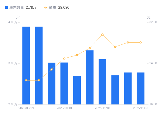 近一年(2024年11月30日至2025年11月28日),星网宇达A股股东户数从4.16万户,减低至2.78万户,降幅33.28%,区间股价上涨22.09%。