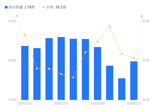 近一年(2025年2月10日至2026年2月10日),视源股份A股股东户数从2.52万户,增加至2.79万户,增幅10.83%,区间股价下跌0.46%。