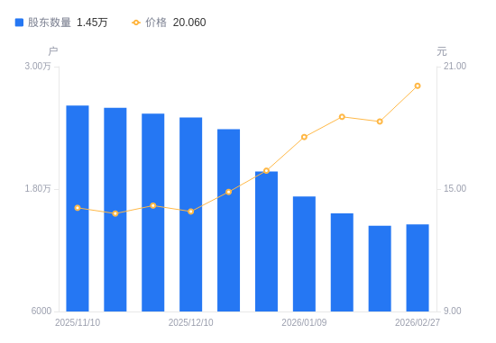 3月4日消息,数据显示,截至2026年2月27日,威星智能A股股东总户数为1.45万户,较上期(2026年2月13日)增加130户,增幅0.90%。公司最新A股总股本为2.21亿股,其中流通A股1.94亿股,户均持有流通A股数量为1.33万股,较上期减少120.1股,降幅0.89%;户均持流通A股市值26.71万元,较上期增加2.11万元,增幅8.58%。