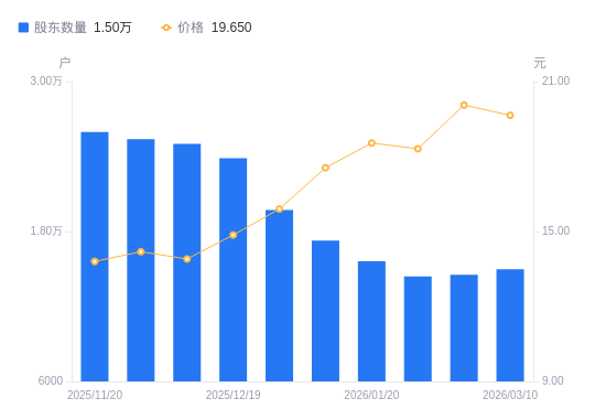 近一年(2025年3月10日至2026年3月10日),威星智能A股股东户数从1.47万户,增加至1.5万户,增幅2.11%,区间股价上涨19.67%。