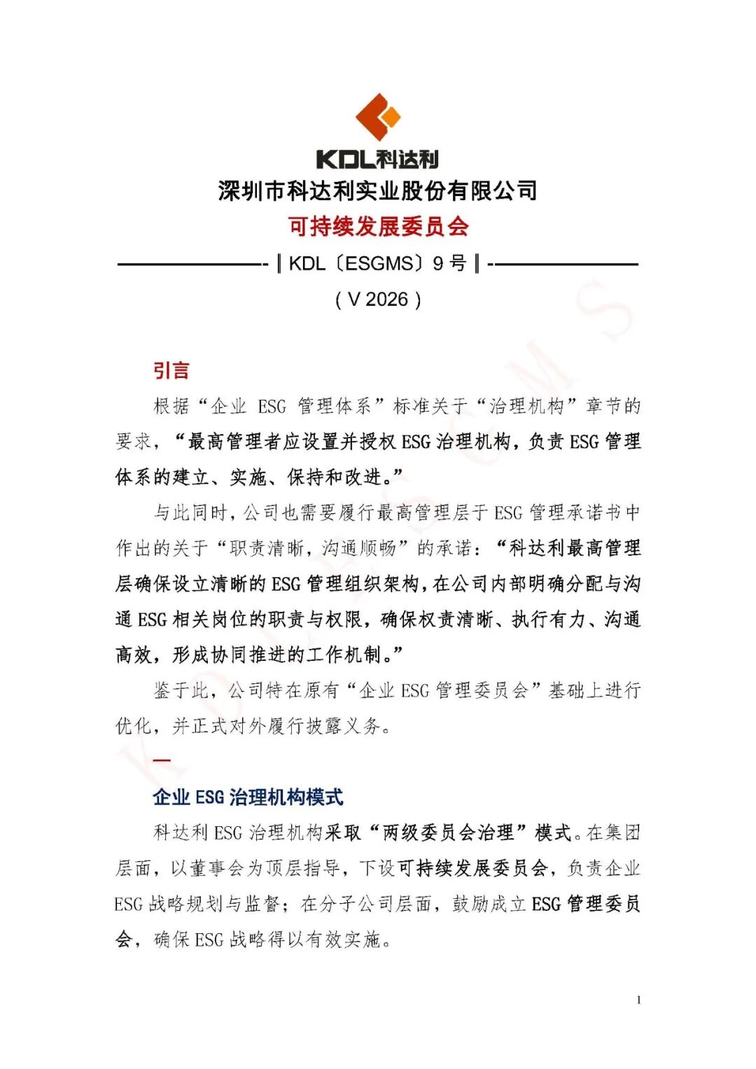 现以公司可持续发展委员会的名义对外披露。同时,亦由可持续发展委员会向公司内部进行发布。本披露旨在向客户、员工、投资者、监管机构及社会各界传达科达利ESG治理机构模式,以增强ESG组织保障信心。