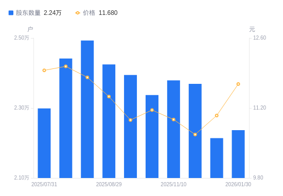 近一年(2025年2月28日至2026年1月30日),道道全A股股东户数从2.45万户,减低至2.24万户,降幅8.66%,区间股价上涨41.47%。