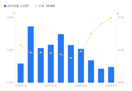 近一年(2025年2月10日至2026年2月10日),洁美科技A股股东户数从1.71万户,减低至1.22万户,降幅28.51%,区间股价上涨101.18%。