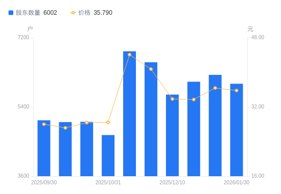 2月4日消息,数据显示,截至2026年1月30日,*ST绿康A股股东总户数为6002户,较上期(2026年1月9日)减少231户,降幅3.71%。公司最新A股总股本为1.55亿股,其中流通A股1.54亿股,户均持有流通A股数量为2.57万股,较上期增加951.17股,增幅3.85%;户均持流通A股市值91.86万元,较上期增加1.95万元,增幅2.16%。