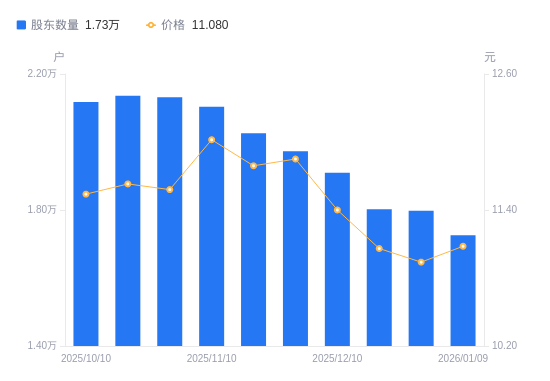 近一年(2025年1月10日至2026年1月9日),中设股份A股股东户数从1.24万户,增加至1.73万户,增幅38.79%,区间股价上涨8.63%。