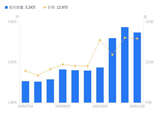 近一年(2024年11月29日至2025年11月28日),京能热力A股股东户数从2.01万户,增加至3.24万户,增幅61.33%,区间股价上涨15.21%。