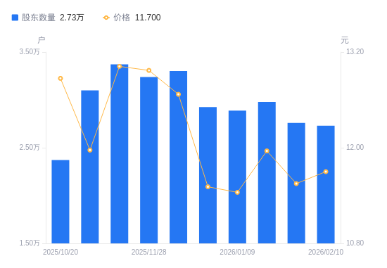 2月12日消息,数据显示,截至2026年2月10日,京能热力A股股东总户数为2.73万户,较上期(2026年1月30日)减少295户,降幅1.07%。公司最新A股总股本为2.64亿股,其中流通A股2.03亿股,户均持有流通A股数量为7428.88股,较上期增加79.43股,增幅1.08%;户均持流通A股市值8.69万元,较上期增加2031.73元,增幅2.39%。