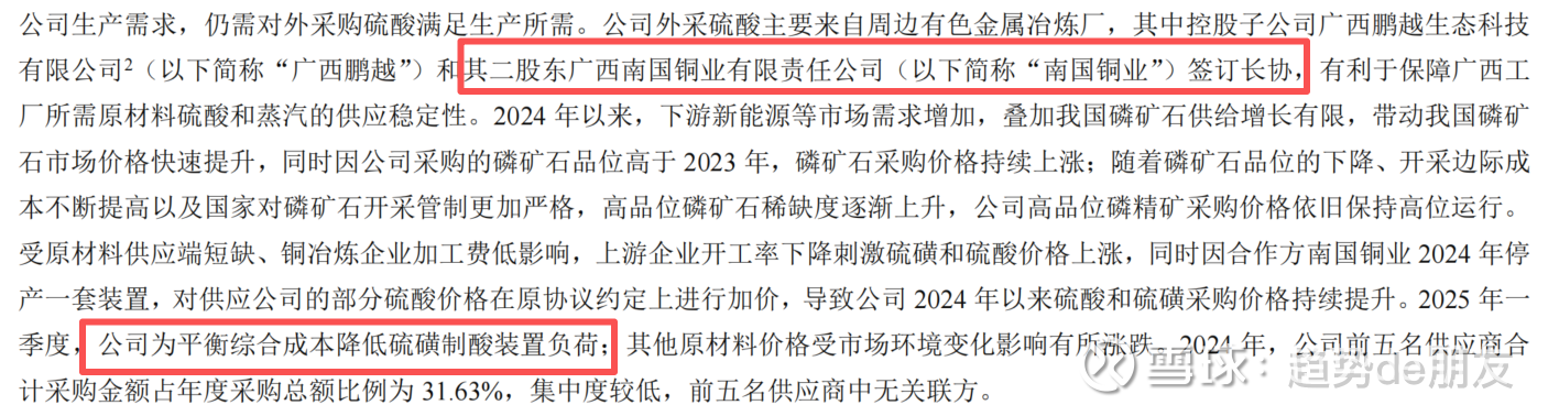 硫酸来源自周边有色金属冶炼厂,其实就是鹏越的二股东,广西南国铜业有限责任公司,与川恒之间签订了长协,用来保证原材料硫酸的供应稳定性。25年因为硫磺涨价,公司已经主动降低硫磺制酸的装置负荷,进而控制硫磺成本。
