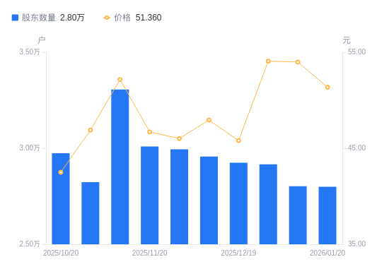 近一年(2025年1月27日至2026年1月20日),意华股份A股股东户数从3.85万户,减低至2.8万户,降幅27.31%,区间股价上涨16.54%。