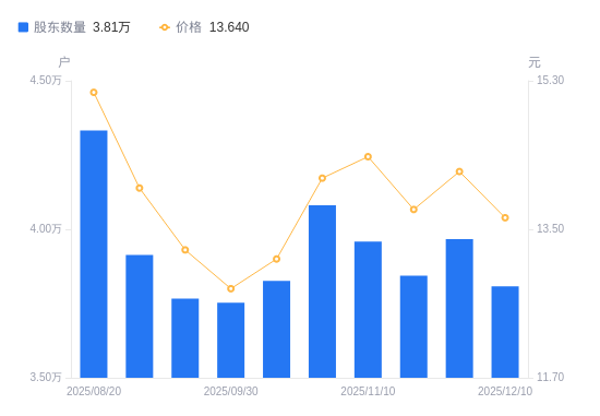 近一年(2024年12月20日至2025年12月10日),哈三联A股股东户数从3.06万户,增加至3.81万户,增幅24.65%,区间股价上涨32.04%。