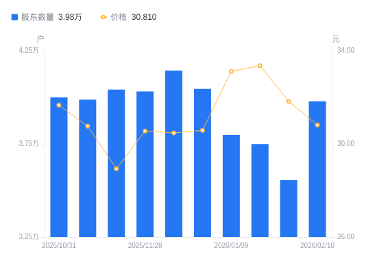 2月12日消息,数据显示,截至2026年2月10日,华阳集团A股股东总户数为3.98万户,较上期(2026年1月30日)增加4223户,增幅11.88%。公司最新A股总股本为5.25亿股,其中流通A股5.25亿股,户均持有流通A股数量为1.32万股,较上期减少1566.96股,降幅10.62%;户均持流通A股市值40.64万元,较上期减少6.32万元,降幅13.45%。