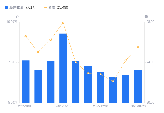 1月21日消息,数据显示,截至2026年1月20日,中欣氟材A股股东总户数为7.01万户,较上期(2026年1月9日)增加3156户,增幅4.71%。公司最新A股总股本为3.25亿股,其中流通A股2.88亿股,户均持有流通A股数量为4106.79股,较上期减少193.48股,降幅4.50%;户均持流通A股市值10.47万元,较上期增加744.62元,增幅0.72%。