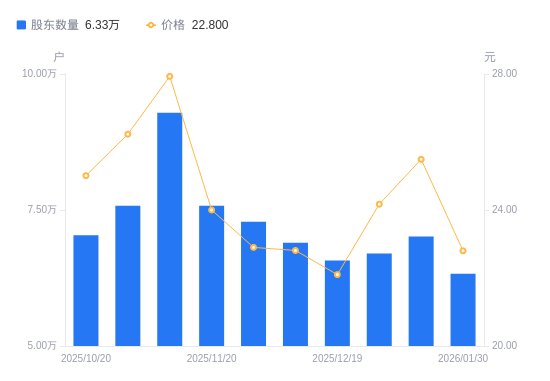 近一年(2025年2月10日至2026年1月30日),中欣氟材A股股东户数从3.13万户,增加至6.33万户,增幅102.29%,区间股价上涨63.21%。