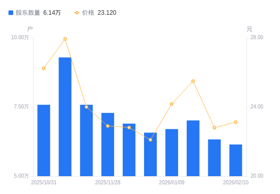 2月11日消息,数据显示,截至2026年2月10日,中欣氟材A股股东总户数为6.14万户,较上期(2026年1月30日)减少1865户,降幅2.95%。公司最新A股总股本为3.25亿股,其中流通A股2.88亿股,户均持有流通A股数量为4689.1股,较上期增加138.15股,增幅3.04%;户均持流通A股市值10.84万元,较上期增加4650.43元,增幅4.48%。