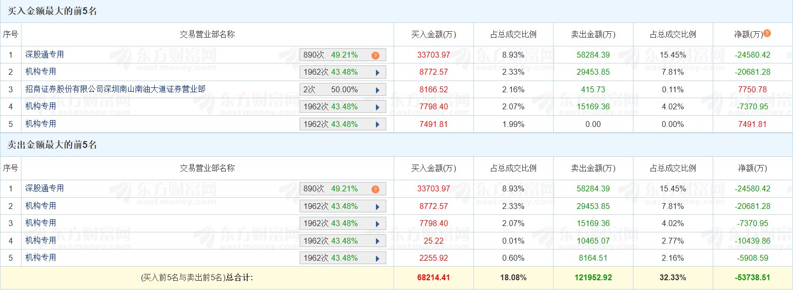 昨日刚创下历史新高的深南电路(002916.SZ)今日跌6.97%,换手率2.27%,成交额37.73亿元。龙虎榜数据显示,深股通买入3.37亿元,卖出5.83亿元,净卖出2.46亿元;五家机构买入2.63亿元,卖出6.33亿元,净卖出3.69亿元。上榜席位全天买入6.82亿元,卖出12.2亿元,合计净卖出5.37亿元。(格隆汇)