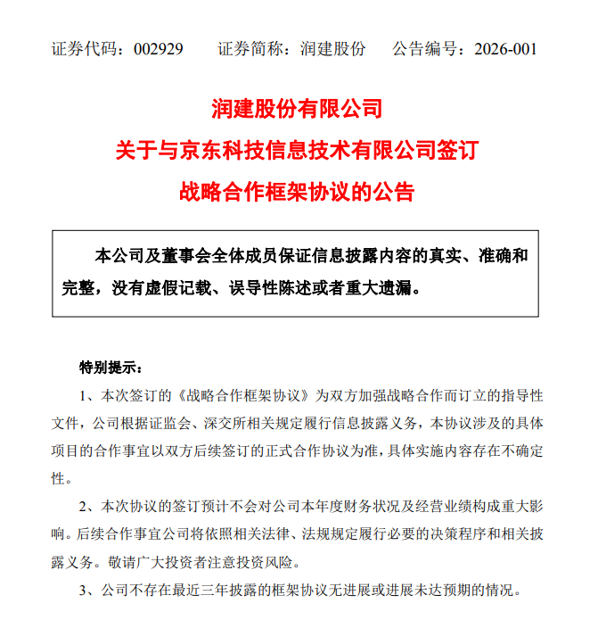 1月8日,润建股份(002929.SZ)公告称,公司与京东科技于2026年1月8日签署了《战略合作框架协议》,双方将围绕AI应用、智算云拓展、智算AIDC合作等多领域开展合作,促进AI技术商业化应用。