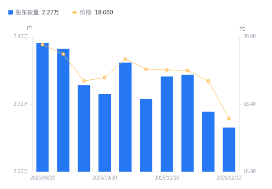 近一年(2024年12月10日至2025年12月10日),明德生物A股股东户数从2.81万户,减低至2.27万户,降幅19.51%,区间股价下跌3.30%。