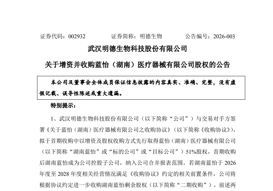 新年伊始,明德生物(002932)战略布局再落关键一子,以3570.10万元成功收购蓝怡(湖南)医疗器械有限公司51%股权,将其纳入控股体系,此举为明德生物深耕慢病管理与高端体外诊断赛道的重要战略举措。