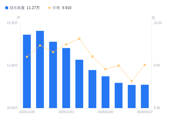 3月2日消息,数据显示,截至2026年2月27日,长城证券A股股东总户数为11.27万户,较上期(2026年2月13日)增加65户,增幅0.06%。公司最新A股总股本为40.34亿股,其中流通A股36.03亿股,户均持有流通A股数量为3.2万股,较上期减少18.45股,降幅0.06%;户均持流通A股市值31.68万元,较上期增加7174.91元,增幅2.32%。