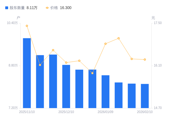 2月12日消息,数据显示,截至2026年2月10日,新疆交建A股股东总户数为8.11万户,较上期(2026年1月30日)减少112户,降幅0.14%。公司最新A股总股本为7.3亿股,其中流通A股7.3亿股,户均持有流通A股数量为8999.5股,较上期增加12.41股,增幅0.14%;户均持流通A股市值14.67万元,较上期增加22.59元,增幅0.02%。