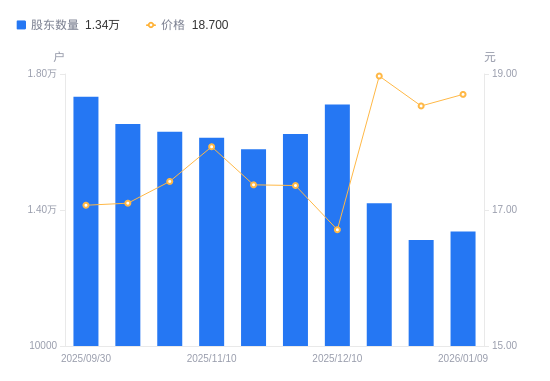 近一年(2025年1月20日至2026年1月9日),新乳业A股股东户数从1.64万户,减低至1.34万户,降幅18.73%,区间股价上涨24.54%。