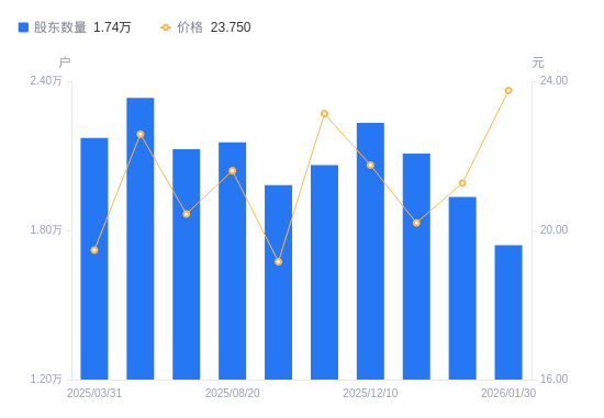 近一年(2025年3月31日至2026年1月30日),亚世光电A股股东户数从2.17万户,减低至1.74万户,降幅19.87%,区间股价上涨9.75%。