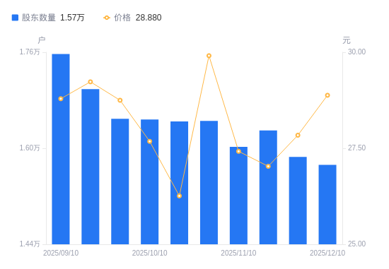 近一年(2024年12月10日至2025年12月10日),鸿合科技A股股东户数从2.26万户,减低至1.57万户,降幅30.53%,区间股价上涨13.16%。
