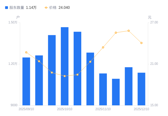 近一年(2024年12月10日至2025年12月10日),西麦食品A股股东户数从1.79万户,减低至1.14万户,降幅36.60%,区间股价上涨67.04%。