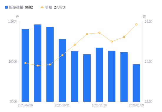 近一年(2025年1月10日至2026年1月9日),西麦食品A股股东户数从1.67万户,减低至9682户,降幅41.86%,区间股价上涨76.75%。