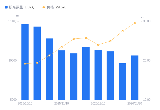近一年(2025年1月20日至2026年1月20日),西麦食品A股股东户数从1.61万户,减低至1.07万户,降幅33.70%,区间股价上涨82.85%。