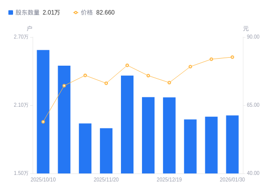 近一年(2025年2月10日至2026年1月30日),博杰股份A股股东户数从1.7万户,增加至2.01万户,增幅18.31%,区间股价上涨146.45%。