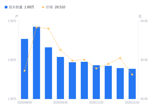 近一年(2024年12月31日至2025年12月19日),朝阳科技A股股东户数从1.42万户,增加至1.89万户,增幅32.62%,区间股价上涨16.32%。