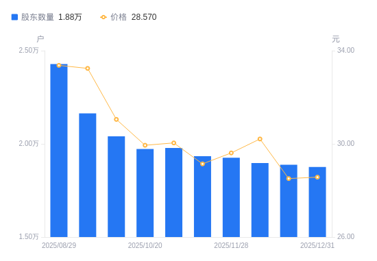 1月6日消息,数据显示,截至2025年12月31日,朝阳科技A股股东总户数为1.88万户,较上期(2025年12月19日)减少120户,降幅0.64%。公司最新A股总股本为1.37亿股,其中流通A股1.19亿股,户均持有流通A股数量为6365.69股,较上期增加40.46股,增幅0.64%;户均持流通A股市值18.19万元,较上期增加1535.51元,增幅0.85%。