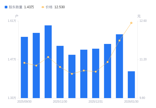 2月2日消息,数据显示,截至2026年1月30日,宇新股份A股股东总户数为1.43万户,较上期(2026年1月20日)减少1341户,降幅8.59%。公司最新A股总股本为3.8亿股,其中流通A股3.02亿股,户均持有流通A股数量为2.12万股,较上期增加1816.7股,增幅9.39%;户均持流通A股市值26.51万元,较上期增加3.51万元,增幅15.28%。