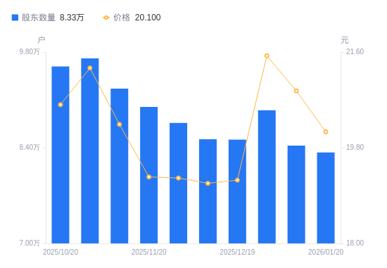 1月21日消息,数据显示,截至2026年1月20日,京北方A股股东总户数为8.33万户,较上期(2026年1月9日)减少1003户,降幅1.19%。公司最新A股总股本为8.67亿股,其中流通A股8.44亿股,户均持有流通A股数量为1.01万股,较上期增加120.5股,增幅1.20%;户均持流通A股市值20.36万元,较上期减少5283.2元,降幅2.53%。