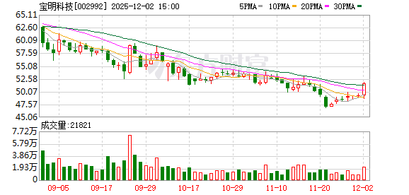 12月2日,宝明科技(002992)发布公告,截至本公告披露日,董事、总经理张春减持计划期限已届满,共计减持28万股,减持均价49元/股,减持比例为0.15%。